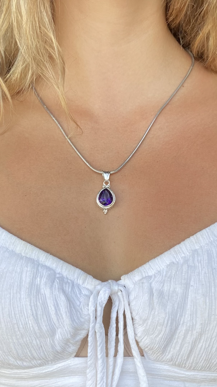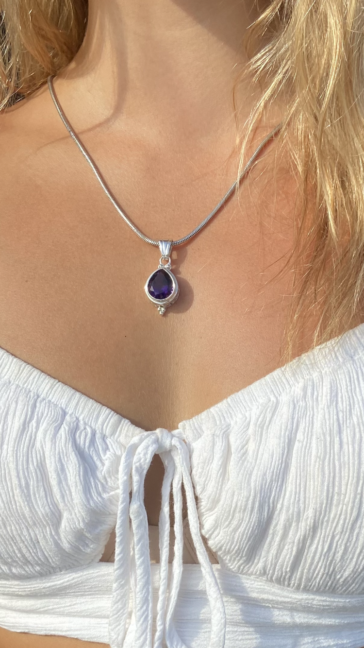 The Elegant Spirit is an original design by Shankari the Alchemist, handmade in Sterling Silver. This spectacular pendant is hinged at the center, allowing for the freedom of movement in the lower half of the design to catch the light. The glittering sky blue of the Blue Topaz is complemented by the deep purple of the Amethyst. The Blue Topaz gemstones will help you to create more Balance in your life as it enhances your powers of Manifestation. It will support your ability to be more tenacious as you overcome your challenges. The Amethyst gemstones will help you build a stronger connection between your mind and your higher-self. This will create Spiritual Strength and support your Creativity.